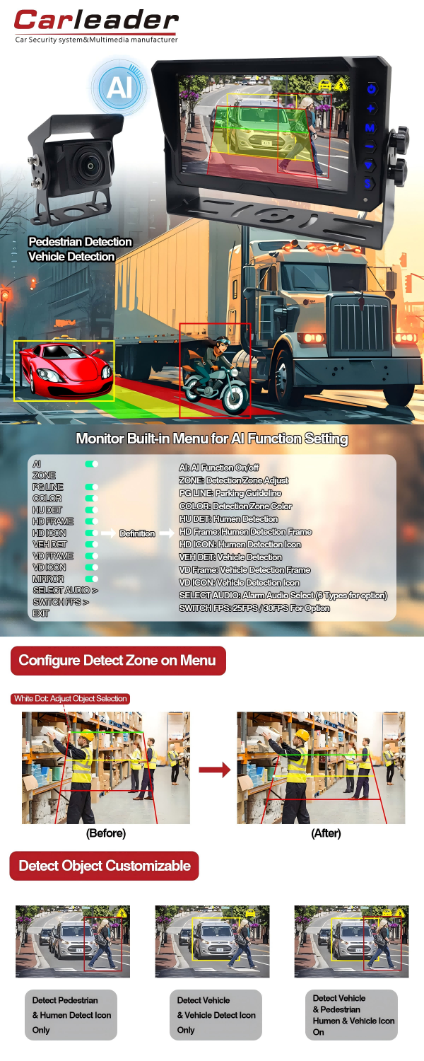 কারলিডার 7 ইঞ্চি এআই বিএসডি ব্লাইন্ড স্পট ডিটেকশন মনিটরিং সিস্টেম সাপোর্ট এআই ক্যালিব্রেশন উন্নত এআই হাই-প্রিসিশন অ্যালগরিদম এবং ব্যবহারকারী-বান্ধব মেনু cz অপারেশন সহ ডিজাইন করা হয়েছে। এই AI ক্যামেরা সিস্টেম চালকদের সব-আবহাওয়া, উচ্চ-নির্ভুল পথচারী এবং গাড়ির গতিশীল সতর্কতা প্রদান করে, কার্যকরভাবে ট্র্যাফিক দুর্ঘটনার ঝুঁকি হ্রাস করে। এআই মনিটরিং ক্যামেরা সিস্টেম ব্যক্তিগত গাড়ি, বাণিজ্যিক ফ্লিট এবং বিশেষ যানবাহনের জন্য উপযুক্ত। ফ্লিট এআই সিস্টেমে শক্তিশালী ইন্টিগ্রেশন এবং সামঞ্জস্য, স্থায়িত্ব এবং রিয়েল-টাইম মনিটরিং ক্ষমতা রয়েছে।