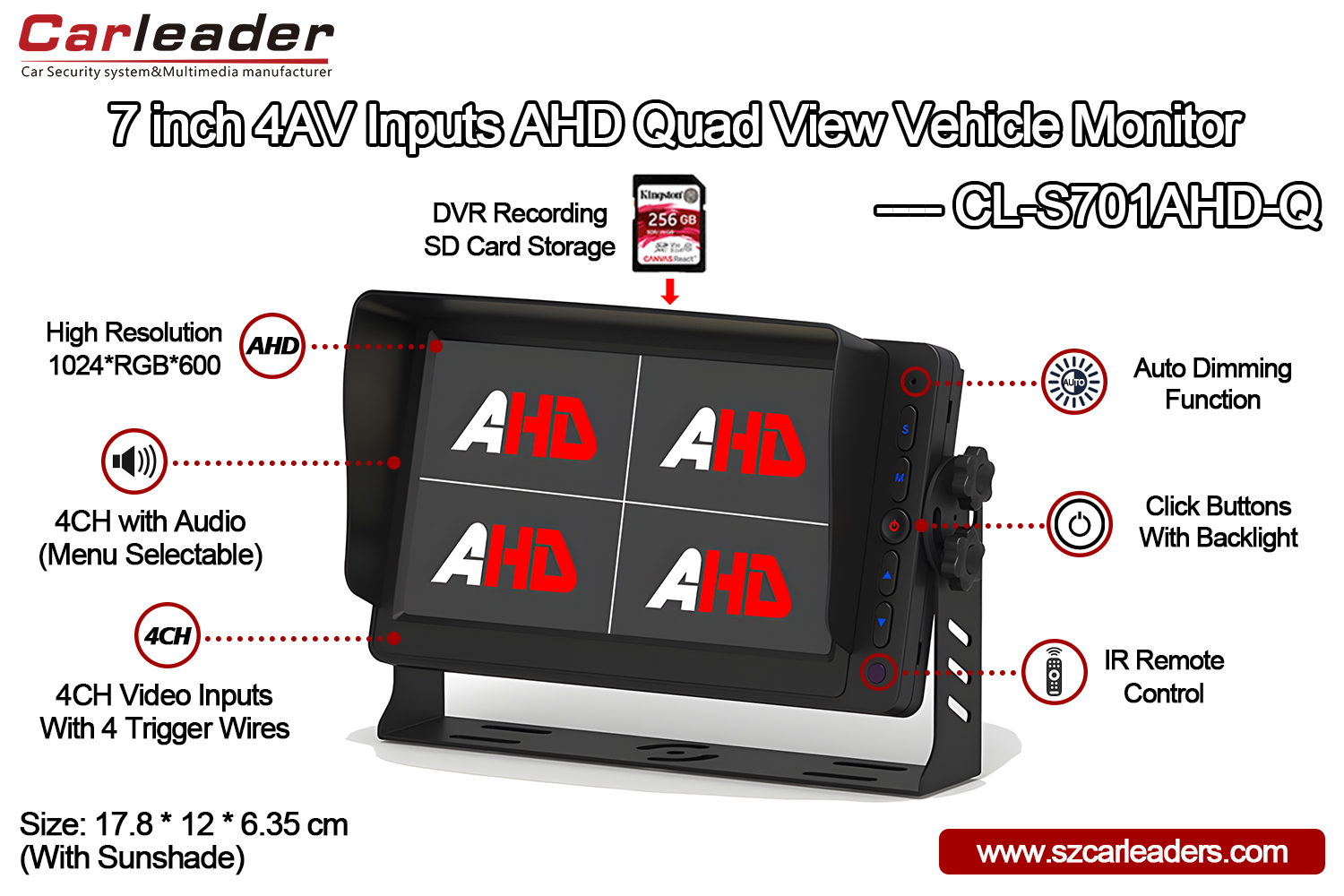 Carleader আপনি আমাদের উপস্থাপন গর্বিত7 ইঞ্চি 4CH AHD ইনপুটস কোয়াড ভিউ ডিসপ্লে মনিটর, কোয়াড ভিউ ডিজাইন গাড়ির ক্যামেরার জন্য 4টি চ্যানেলকে সমর্থন করতে পারে, যেমন, সামনের দৃশ্য, সাইড ভিউ x2, রিয়ার ভিউ, বড় যানবাহনের চালকদের (বাস, ট্রাক এবং ডেলিভারি ভ্যান, গাড়ি চালানোর সময় তাদের আশেপাশের একাধিক দৃশ্য পর্যবেক্ষণ করতে দেয়।