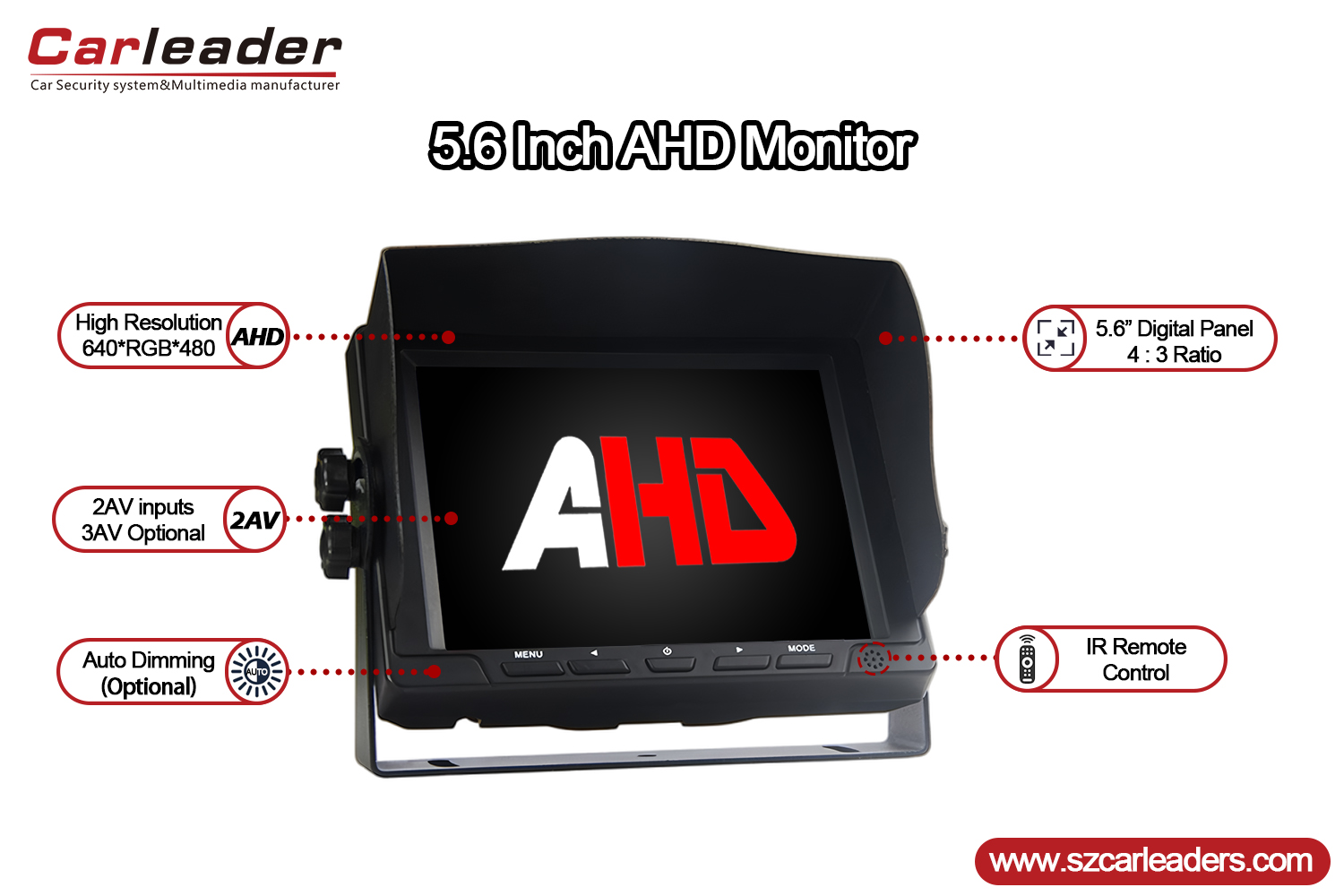 কারলিডার5.6 ইঞ্চি 2CH AHD ইনপুট যানবাহন ব্যাকআপ মনিটরএকটি পেশাদার-গ্রেড 5.6 ইঞ্চিAHD রিয়ার ভিউ মনিটর, যানবাহনের নিরাপত্তা এবং পর্যবেক্ষণ ব্যবস্থার জন্য একটি পরিষ্কার, নির্ভরযোগ্য চিত্র প্রদানের জন্য ডিজাইন করা হয়েছে। একটি আধুনিক নকশা এবং শক্তিশালী কার্যকারিতা সমন্বিত, এটি বাণিজ্যিক এবং ব্যক্তিগত যানবাহনের জন্য একটি আদর্শ সমাধান যার জন্য নির্ভরযোগ্য পিছনের দৃষ্টি প্রয়োজন।