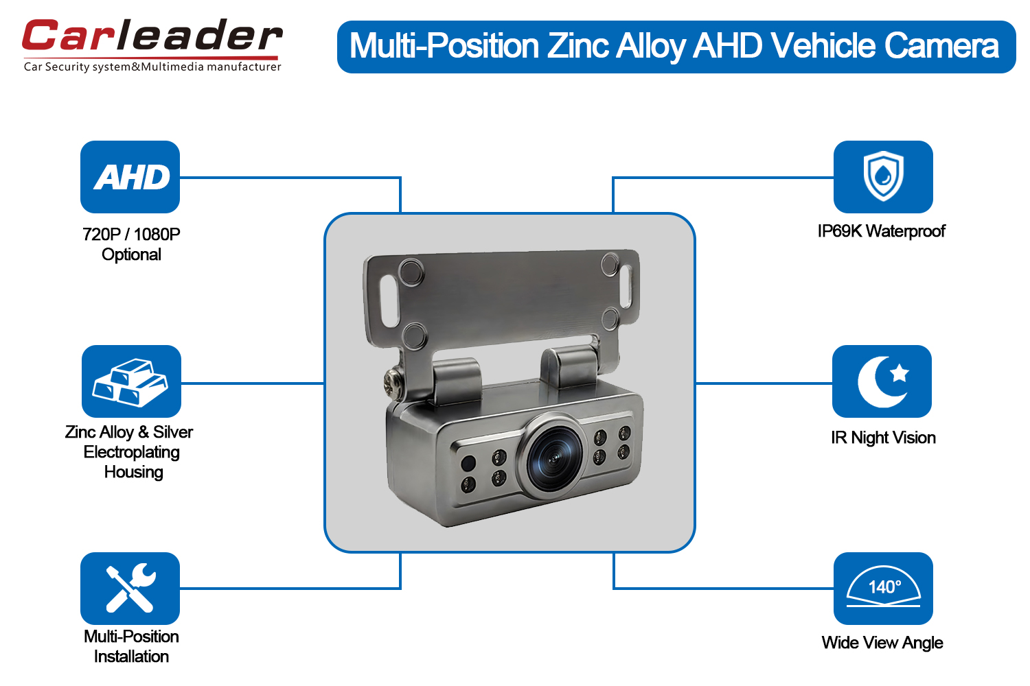 কারলিডারAHD সিলভার ইলেক্ট্রোপ্লেটিং ভেহিকেল রিভার্সিং ক্যামেরা, জিংক অ্যালয় হাউজিং এবং সিলভার ইলেক্ট্রোপ্লেটিং, 140 ডিগ্রী ওয়াইড ভিউয়িং অ্যাঙ্গেল এবং IP69K ওয়াটারপ্রুফ এবং ডাস্টপ্রুফ। ইনস্টলেশন কোণ এবং অবস্থান এছাড়াও screws দ্বারা সংশোধন করা যেতে পারে.