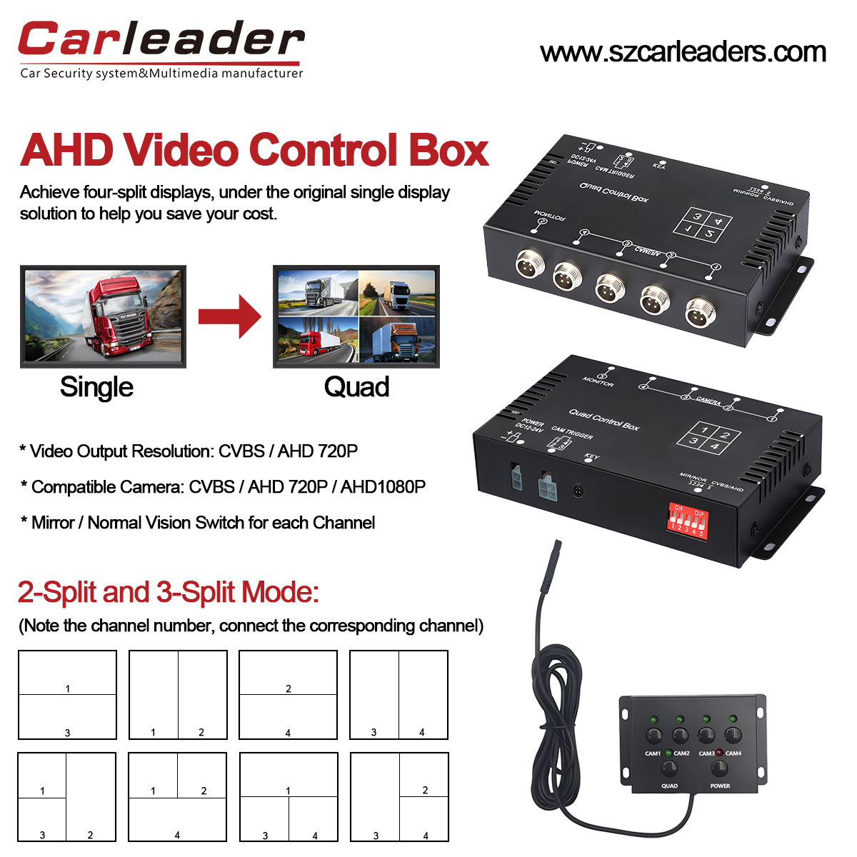 এই AHD কোয়াড ভিডিও স্প্লিট বক্সের মূল হল একটি পাওয়ার সাপ্লাই এবং একটি ভিডিও মাল্টিপ্লেক্সার, যা যানবাহনের জন্য একটি ডিভাইসে মিলিত। যেমন বাস, ট্রাক, ট্রেলার এবং অন্যান্য ভারী শুল্কের যানবাহন। 4-চ্যানেলটি চারটি স্বাধীন AHD ক্যামেরা সমর্থন করার জন্য ডিজাইন করা হয়েছে। এবং একটি একক মনিটরের সাথে কাজ করুন। কোয়াড ভিউ হল AHD 4 চ্যানেল কন্ট্রোল বক্সের প্রাথমিক কাজ। গাড়ির AHD স্প্লিট কন্ট্রোল বক্স চারটি সংযুক্ত গাড়ির ক্যামেরা থেকে ভিডিও সংকেত গ্রহণ করে এবং একটি একক স্ক্রীন মনিটরে একই সাথে চারটি ছবি প্রদর্শন করে। কন্ট্রোল বক্স বক্সের অন্যান্য ফাংশনকে বোঝায়, AHD স্প্লিট কন্ট্রোল বক্স ক্যামেরাকে শক্তি প্রদান করে এবং একটি একক ডিসপ্লে বা স্প্লিট-স্ক্রিন ডিসপ্লে নিয়ন্ত্রণ করে। AHD (অ্যানালগ হাই ডেফিনিশন) ডিসপ্লে এবং কন্ট্রোল বক্সের সাথে সামঞ্জস্যপূর্ণ ভিডিও ফরম্যাটগুলি নির্দিষ্ট করে। AHD ভিডিও কন্ট্রোল বক্স AHD ক্যামেরা (যেমন, AHD 720p, 1080p) বা CVBS ক্যামেরার জন্য উপযুক্ত। শুধুমাত্র চারটি AHD ক্যামেরা বা চারটি CVBS ক্যামেরা একই সাথে সমর্থিত।