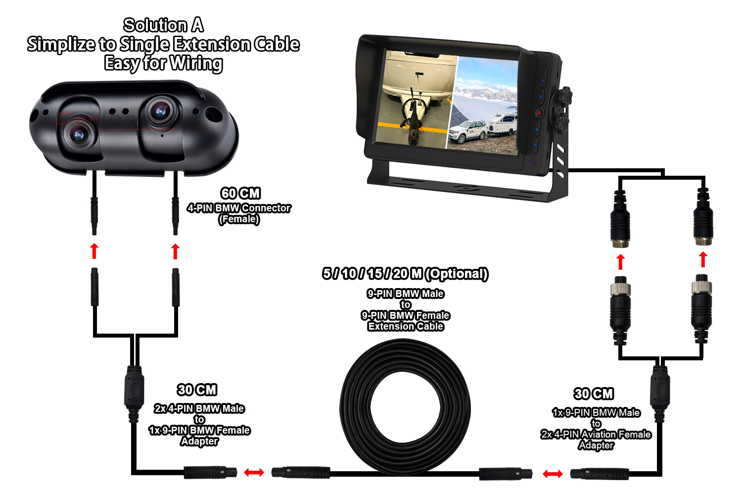প্রথম সমাধান শুধুমাত্র একটি এক্সটেনশন তারের (9-পিন BMW সংযোগকারী), 1 থেকে 2 বিভক্ত তারের উভয় প্রান্তে ক্যামেরা এবং মনিটর সংযোগের জন্য ব্যবহার করুন। কারণ এই সমাধান শুধুমাত্র আমাদের এক্সটেনশন তারের উপর, যা তারের প্রক্রিয়া সহজ এবং আরো সুবিধাজনক করে তোলে।