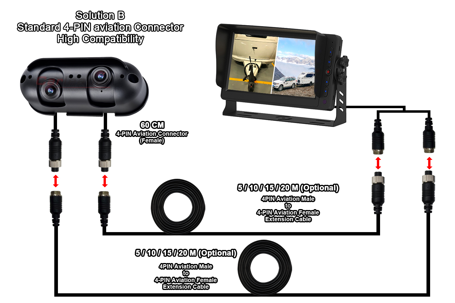 কারলিডারRV Motorhome-এর জন্য AHD স্টারলাইট ডুয়াল লেন্স রিয়ার ভিউ ক্যামেরার জন্য দুটি ভিন্ন ওয়্যারিং সলিউশন অফার করবে, বিভিন্ন ওয়্যারিং প্রয়োজনে ফিট করার জন্য:
