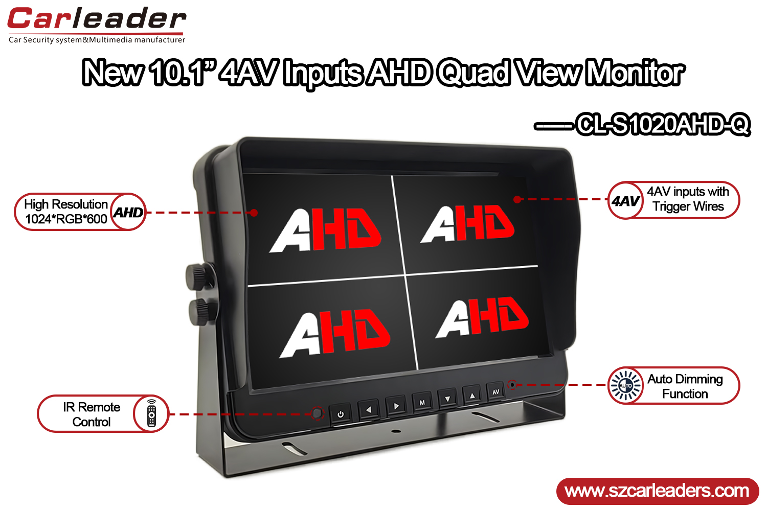যানবাহন, নিরাপত্তা, এবং শিল্প পর্যবেক্ষণ অ্যাপ্লিকেশনের জন্য আদর্শ,কারলিডার10.1 ইঞ্চি 4CH কোয়াড ডিসপ্লে হেভি ডিউটি ভেহিকেল AHD মনিটরএকটি কমপ্যাক্ট এবং টেকসই প্যাকেজে শক্তিশালী কার্যকারিতা, স্পষ্ট প্রদর্শন গুণমান এবং ব্যবহারকারী-কনফিগারযোগ্য বিকল্পগুলিকে একত্রিত করে।